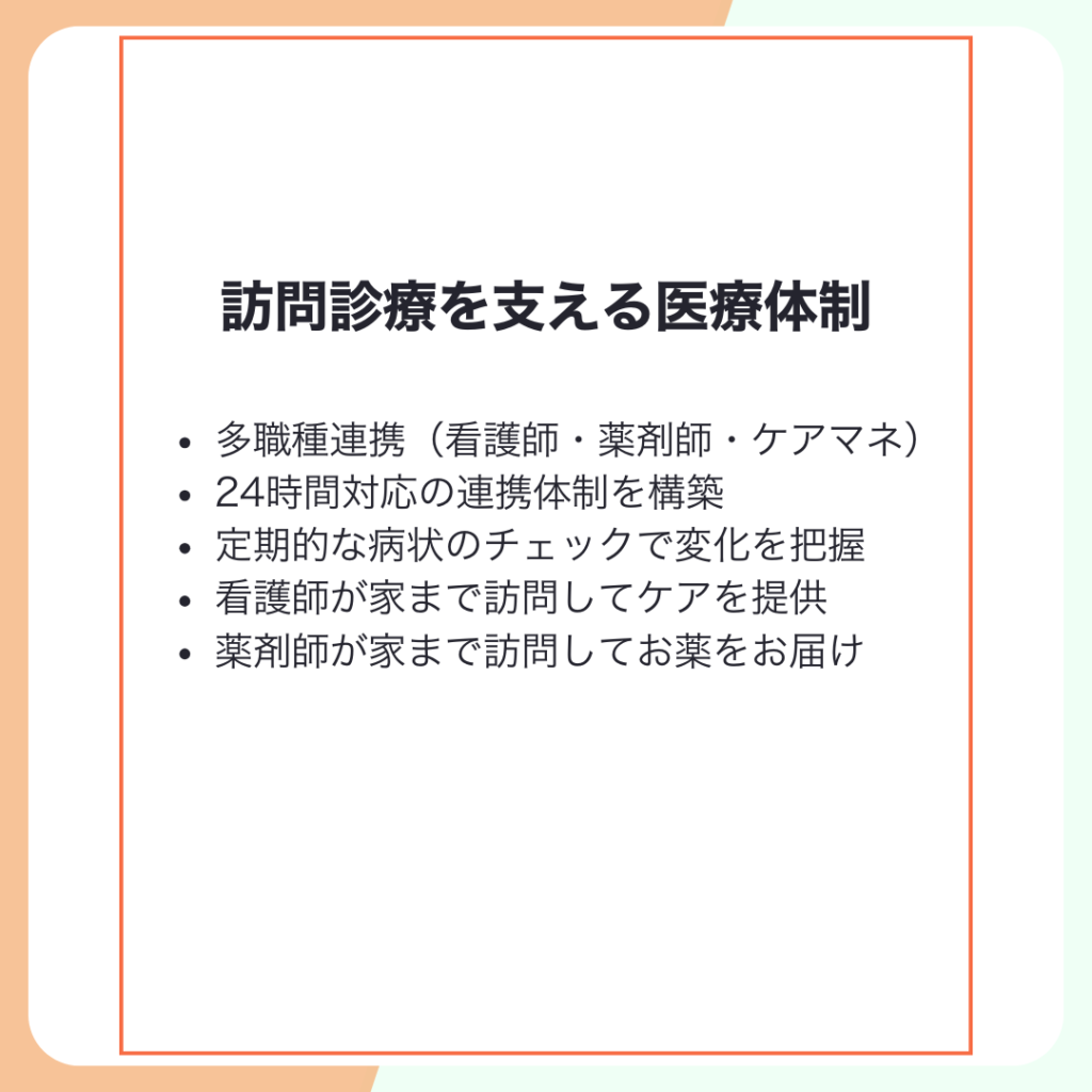 | 医療体制 | 多職種連携(看護師・薬剤師・ケアマネ) |