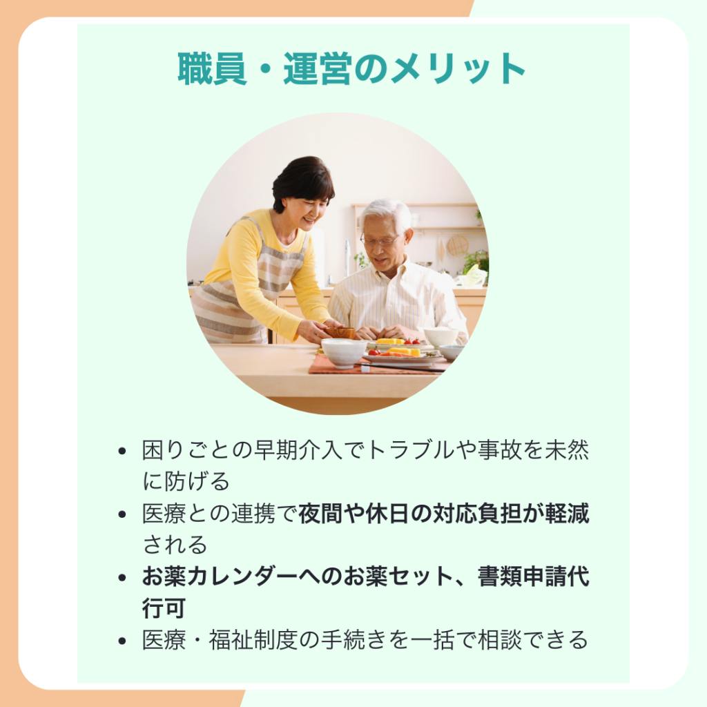医療連携を強化し、トラブルの予防と“暮らしの安定”をサポートします。