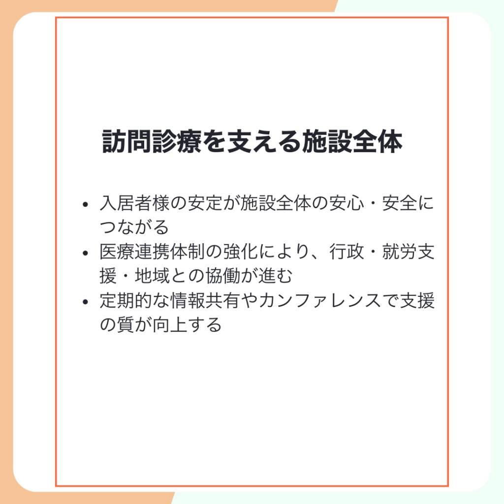 私たちは定期的な訪問診療を通じて、専門的な精神科医療を提供し、入居者様と職員様の双方を支援します。